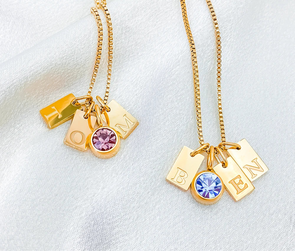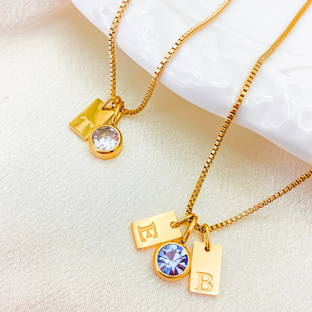 Personalize your look with the Engraved Silver Charm Necklace with Initial and Birthstone. This Necklace blends Initial Jewelry charm and Birthstone Jewelry sparkle with a Silver finish. Crafted from 14K gold-plated stainless steel on a 42 + 5 cm adjustable box chain, it’s perfect for solo wear or layering.