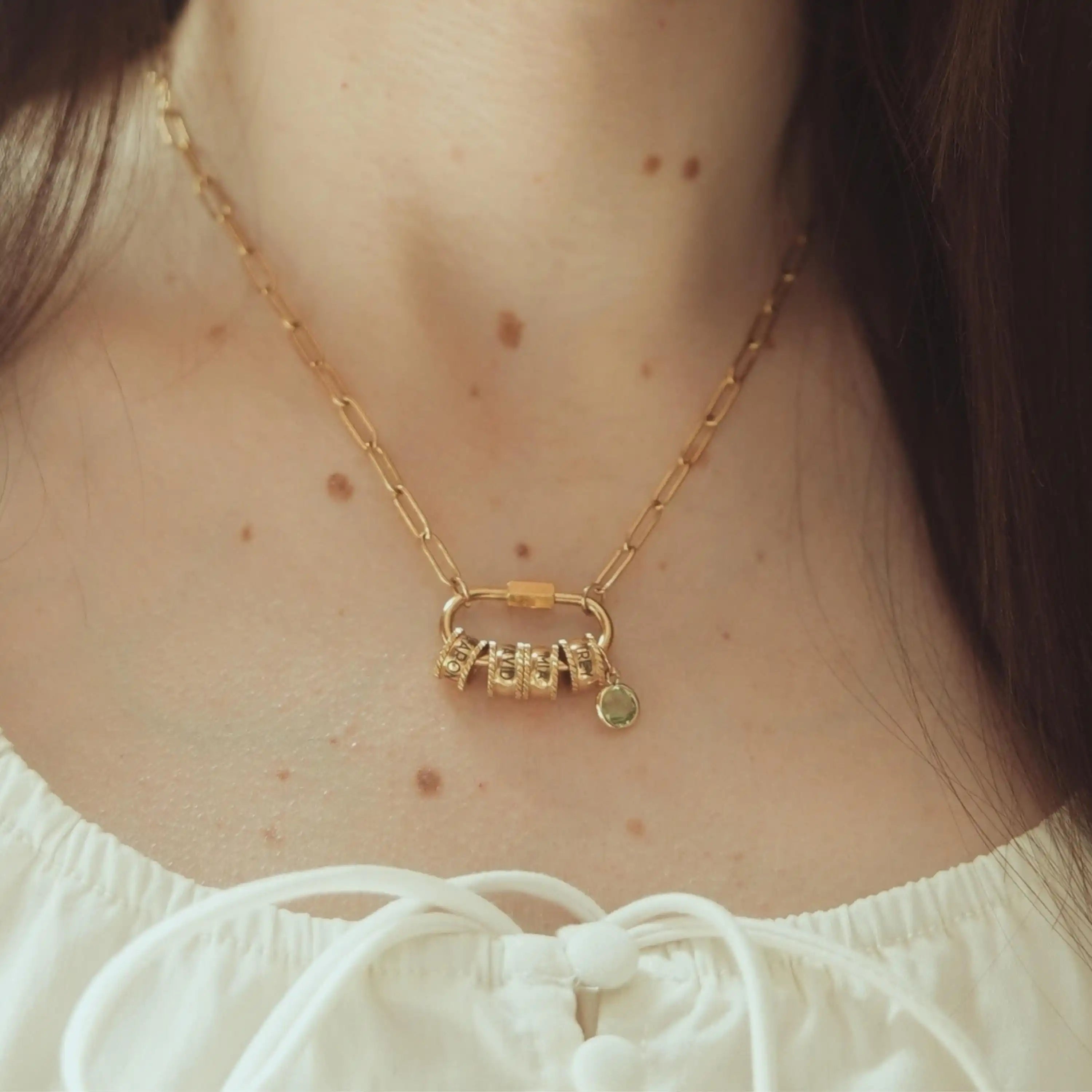 Gold Carabiner Lock Necklace with Name Beads and Birthstone